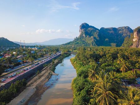 Cityscape Saphli and bridge along Saphli Beach and mountain at Khao Dinsao ViewPoint in Chumphon ,Thailand.