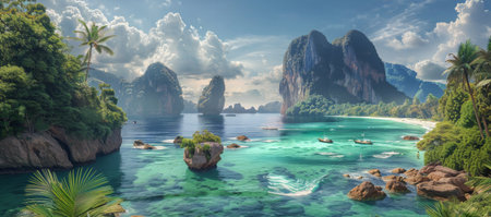 Beautiful tropical landscape with rocks and palm trees. Boats sailing in the bay on background. Cloudy blue sky. Travel destination Asia