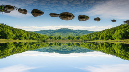 Surrealistic landscape with distorted reality, creative composition of wildlife, mirror reflection of mountains and forests, fantastic illustration