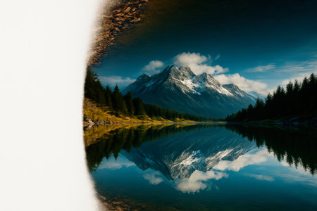 Landscape with mountains and reflection in water. Collage. Selective focus.