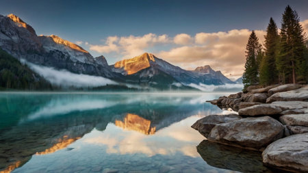 A stunning misty lake landscape featuring a serene atmosphere with trees reflecting on calm water. The early morning light creates a peaceful scene, perfect for nature lovers.