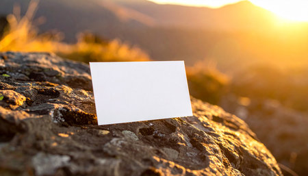 Image showing blank white card on a rocky surface with a golden sunset in the background keywords: card,...