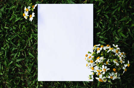 White paper with space for text that have Spanish needles or Bidens alba flowers set at corners on green grass background.
