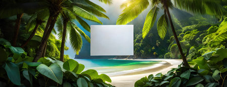 A pure rectangular white paper hovering in the air on a tropical sandy beach with the calm ocean in the background..