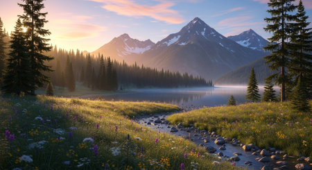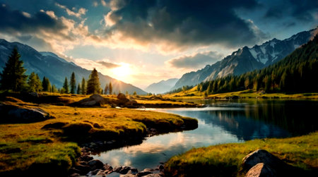 Picturesque mountain lake scenery at sunset with blooming meadow