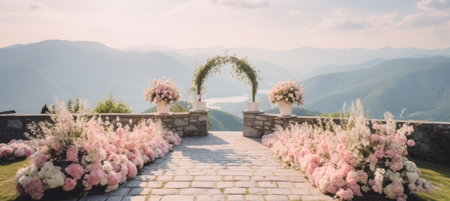 Elegant outdoor wedding ceremony setup with floral arrangements and mountain backdrop in the afternoon light