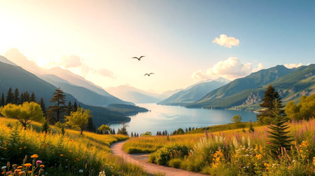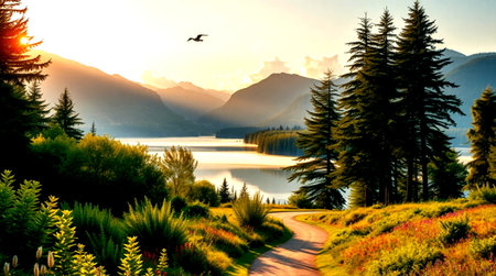 AI Generated. Over range hiking lined beautiful pastel sunlight spring blowing forest of glimmering hidden range with shore vintage colorful falling window