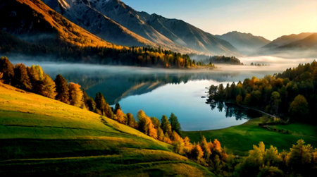Panorama of the lake on a foggy morning mountains. Generative AI.