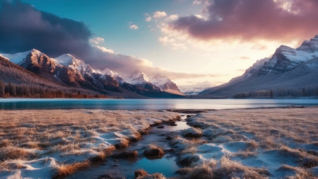 A beautiful view of a lake surrounded by snow-capped mountains in Canada