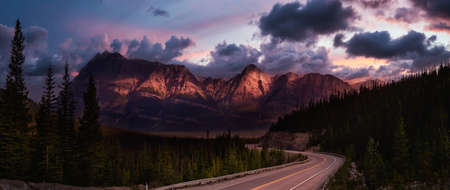 Scenic road in the Canadian Rockies. Dramatic Colorful Sunset Sky. Taken in Icefields Parkway, Banff National Park, Alberta, Canada.