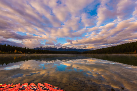 Majestic lake Patricia at sunrise. Red canoe sports boats are dried by the lake. Rocky Mountains of Canada. Jasper Park. The concept of active, northern and photo tourism