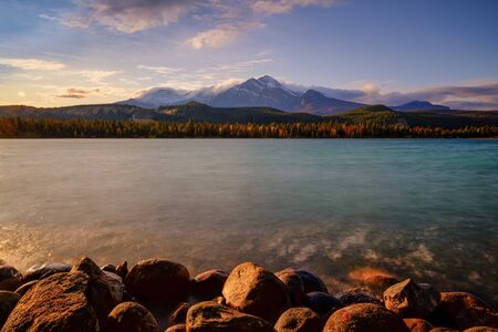 The sunrise over a cold lake. Majestic lake Patricia in Jasper National Park, Rocky Mountains of Canada. The concept of active, northern and photo tourism