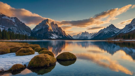 Mountain lake with reflection in the water at sunset. Canadian Rockies, Alberta, Canada