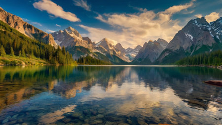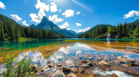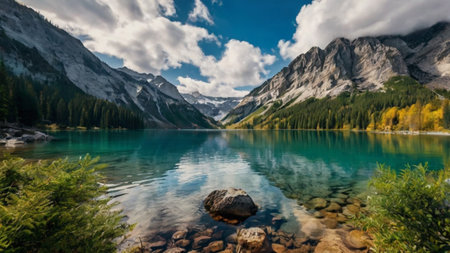 Beautiful alpine lake with crystal clear water and mountains in background