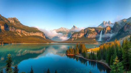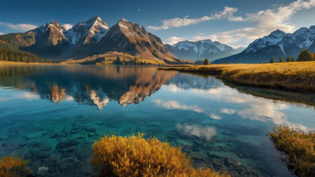 panoramic view of alpine lake with reflection of mountains in water