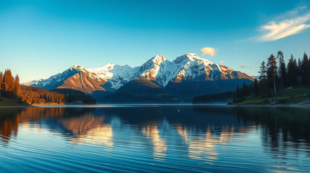 Mountain lake with reflection of snow-capped peaks in the water