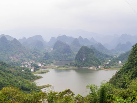 Landscape scenery view of karst mountains and lake in Yangshuo Guilin China