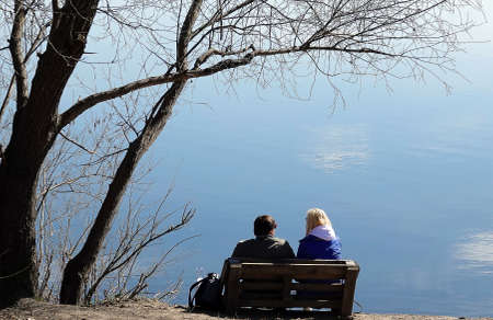 Kiev, Ukraine April 3, 2021: a man and a woman sit on the shore of the lake