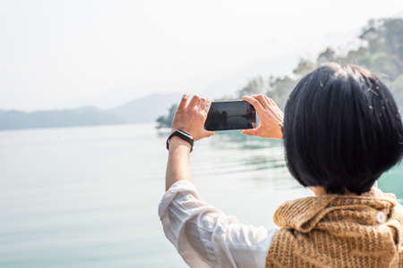 traveling woman take a picture near Sun Moon Lake, Nantou, Taiwan