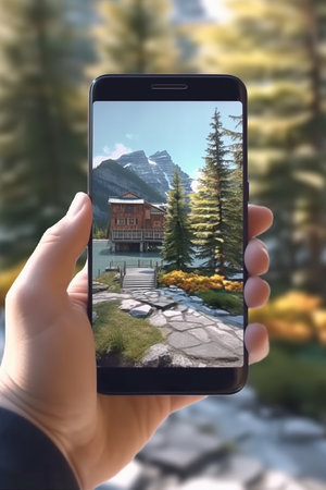 Hands holding mobile phone with landscape view of mountain lake and forest