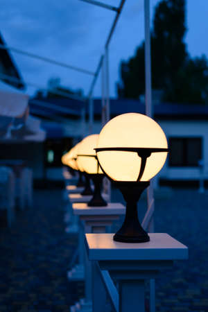 Light bulbs against the evening blue sky. Lanterns glowing with a pleasant warm yellow light.