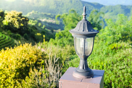 Outdoor old lantern on green nature at Doi Mae Salong view point in Chiang Rai Province Thailand