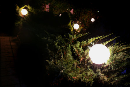 Park or garden with warm light bulbs, street lamps at evening or night, decorative illumination, celebration, cozy Christmas background