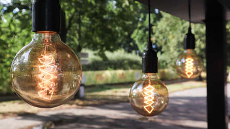 Edison incandescent bulbs hang in a retro loft style. Cafeteria decoration close-up. Street decor Light lanterns Warm light. Soft focus, blurred street background.