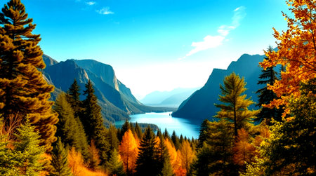 A stunning panoramic view of a serene mountain lake, featuring a pristine reflection of majestic peaks and lush forests under a clear blue sky. This image evokes tranquility, natural beauty, and the grandeur of untouched wilderness