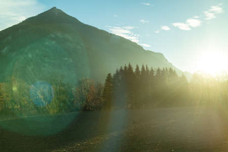 Autumn rural landscape with high mountain and forest area on a background of sun light and blue sky, Austria.