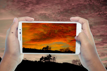 A closeup of a male's hand taking a picture of a beautiful sunset with his phone