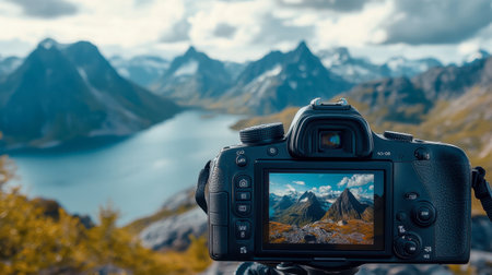 Person is holding a mobile device, capturing a photograph of a serene lake scene. The background displays a range of mountains, while the foreground reveals a body of water and a shoreline. The overall scene evokes a sense of tranquility and natural beauty.