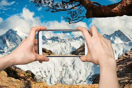 man hands holding mobile phone at Sea and mountains. Tourist on nature makes the photo on the phone