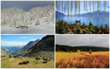 Collage of four pictures of beautiful landscape with mountains and lake.