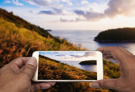 man hands holding mobile phone at Sea and mountains. Tourist on nature makes the photo on the phone