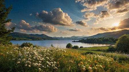 Panoramic view of a lake and mountains at sunset in summer