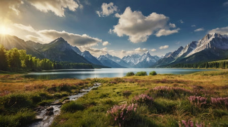 A body of water surrounded by trees and mountains. AI generative image.