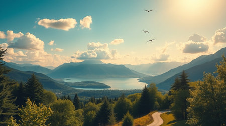 AI Generated. Over range hiking lined beautiful pastel sunlight spring blowing forest of glimmering hidden range with shore vintage colorful falling window