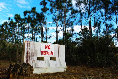 No Trespassing sign against a snowy landscape. No Trespassing sign on a snow covered property in Daybreak, Utah. The sign prohibits people from trespassing into the property under video surveillance.