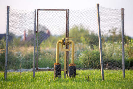 Metal Net in front of green garden after the rain. Lithuania, Nida