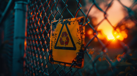 top view of triangle with warning toxic symbol on grass, post apocalyptic concept