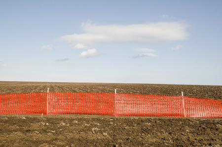 Orange perforated plastic foil barriers against snow in farmland. This protects the snow cover on agricultural fields. The fence for snow retention on the field.