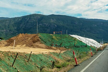 Construction works on a new country highway with the start of an overpass to replace the old road which floods