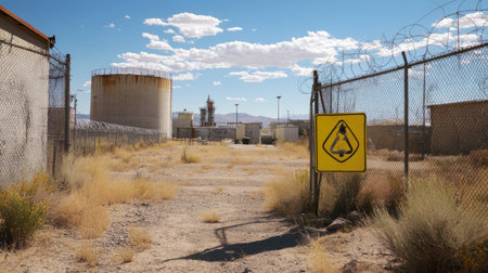 A nuclear waste disposal site with large concrete storage containers, barbed wire fences, and a radioactive warning sign posted at the entrance.