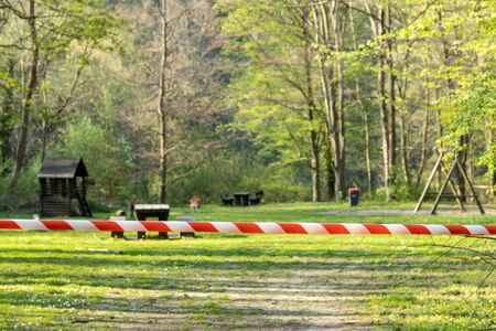 cordoned off playground, surroundet by trees, forcus on barrier tape