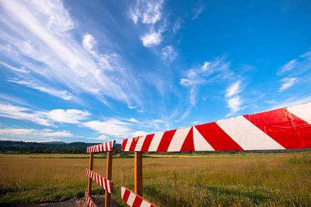Red and white barrier tape, fenced off dangerous place or crime scene in the forest.
