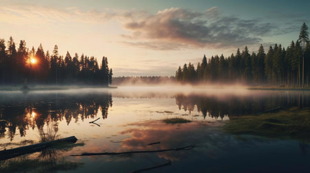 Capture the essence of a tranquil morning scene with mist drifting over a calm lake, surrounded by majestic evergreen trees and mountains.