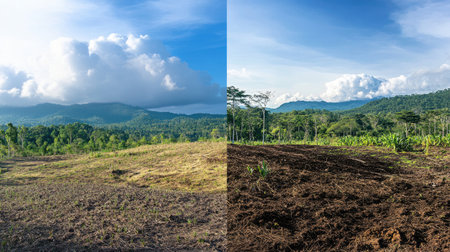 A striking contrast of landscape transformation showcasing deforestation and its impact on the environment. Lush greenery meets bare soil under a clear sky.