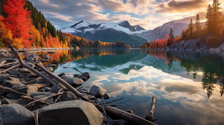 a serene lake surrounded by vibrant maple trees in full autumn splendor reflects their colors on the calm water's surface. this tranquil scene captures the beauty of nature during the fall season, with a glacier and golden hour light adding to the enchanting atmosphere. ai generated