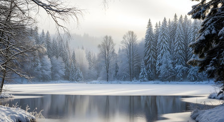 A winter wonderland scene with a frozen lake and trees covered in snow, A frozen lake surrounded by snow-covered pine trees, AI Generated